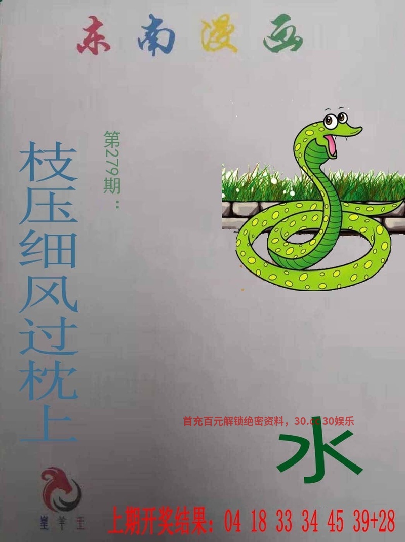 279期:今期生肖三四开,穿金戴银戴兰花。红蓝特码有钱拿,三申五令下圣旨。春风得意发财时,田叶荷花莲藕香。金木五行在本期,红绿相同个数定。 |